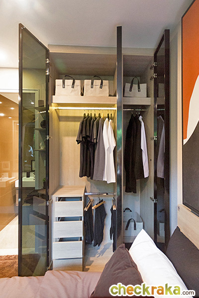 ภายในตู้ยังมีไฟ บานซ้ายมีลิ้นชักด้านล่าง 4 ชั้น ราวสำหรับแขวนกางเกง และชั้นเก็บของด้านบน ส่วนบานทางขวาสามารถแขวนเดรสยาวๆ ได้เลย ด้านบนเป็นชั้นวางของเหมือนกัน ระยะห่างจากตู้เสื้อถึงเตียงประมาณ 55 ซม. เปิดประตูตู้เสื้อผ้าได้ไม่ชนเตียง