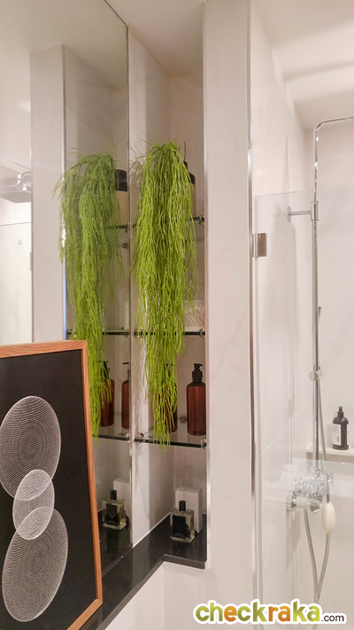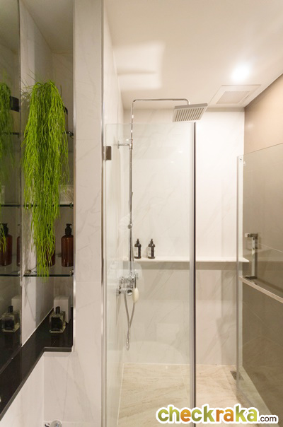 ในโซนเปียกได้ฉากกั้นอาบน้ำกระจกเทมเปอร์แบบเปิดเข้าด้านในของ Oversea ที่ผนังก่อเป็น Low-Wall หินเทียม สำหรับวางสบู่ แชมพูอาบน้ำ Rain Shower เป็นของ American Standard และพัดลมระบายอาศของ Panasonic