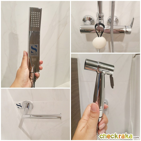 ฝักบัวอาบน้ำ ก๊อกน้ำ ที่ใส่กระดาษทิชชู่ และสายฉีดชำระ เป็นของ American Standard