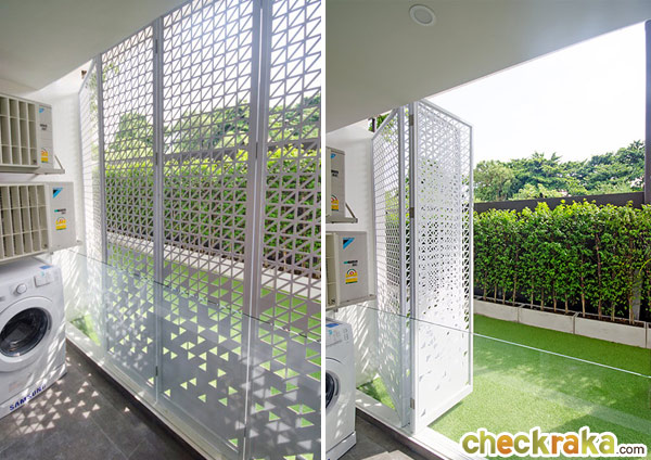 ที่ระเบียงได้บานเฟี้ยมลายฉลุสีขาวแบบ 3 ตอน สามารถเลื่อนปิด-เปิดได้ 2 ตอน ส่วนตอนในสุดเป็นแบบบานฟิก วัสดุเป็นอะลูมิเนียม มีน้ำหนักเบา กันสนิม ด้านล่างจะออกแบบให้ค่อนข้างทึบแสงมีลายฉลุเพียงเล็กน้อยเพื่อช่วยในการบังสายตาจากบุคคลภายในไม่ให้เห็นภายในห้องพักอาศัย ส่วนด้านบนออกแบบให้เป็นลายฉลุเต็มบานเพื่อช่วยระบายอากาศและเพิ่มความสวยงาม สามารถ Lock ได้