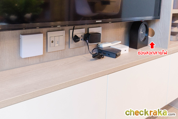 ด้านล่างเจาะเป็นช่อง (วงกลม) สำหรับสอดสายไว้ให้ เผื่อลูกบ้านอยากติดกล่องทีวีดิจิตอลสายจะได้เป็นระเบียบไม่เกะกะ