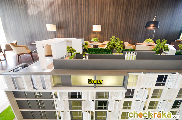 ห้องฟิตเนส จะตั้งอยู่บนชั้น 8 ผนังกระจกมองเห็นวิวด้านนอกฝั่งทิศเหนือ สำหรับพื้นของห้องฟิตเนสมีความพิเศษกว่าหลายๆ โครงการโดยจะปูด้วยกระเบื้องแผ่นยาง (Rubber Floor) ที่ออกแบบให้มีความหนาเป็นพิเศษกว่าพื้นปกติทั่วไป 2 เท่า เพื่อรองรับการกระแทกได้เป็นอย่างดีเวลาที่ลูกบ้านเข้ามาใช้บริการ และอาจจะปล่อยลูกตุ้มหรือบาร์เบลลงพื้นแรงๆ