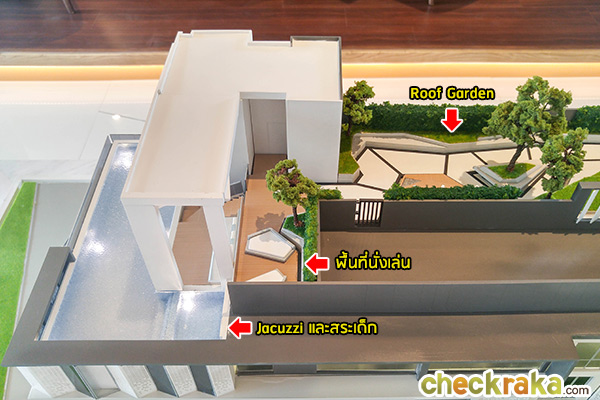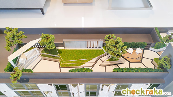 สวน Roof top บนชั้นดาดฟ้าปูหญ้าทั้งหมดลูกบ้านสามารถขึ้นมาวิ่งจ๊อกกิ้งบนนี้ได้เลย และยังมีมุมนั่งเล่นพักผ่อนกลางแจ้งมาให้ 2 จุดพร้อม โดยจุดหนึ่งออกแบบเป็นศาลาระแนงไม้สีขาวสำหรับบังแดดมาให้