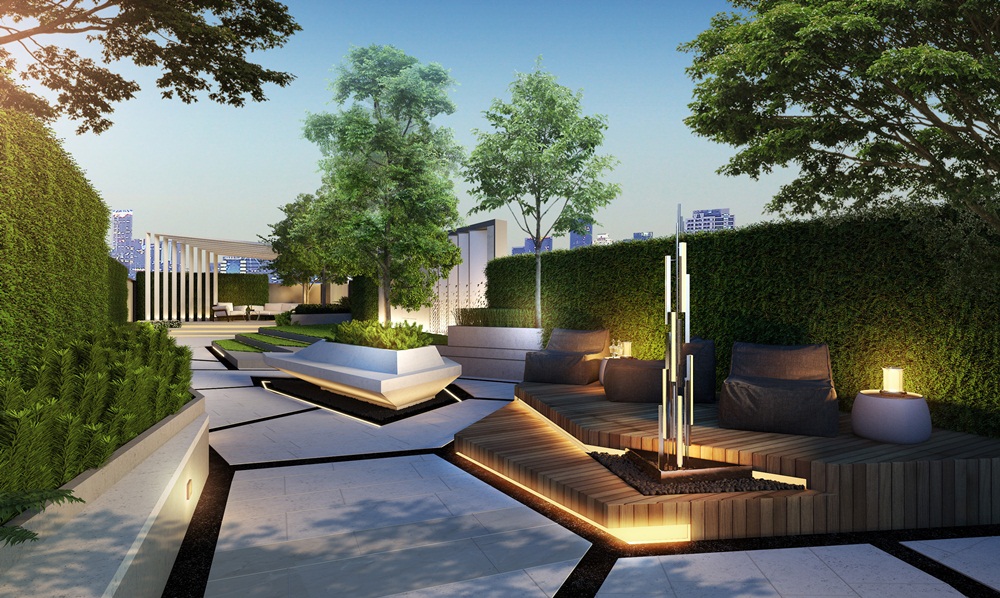 จากสระว่ายน้ำเดินขึ้นบันได้เชื่อมต่อมายังสวนบนชั้นดาดฟ้า มีพื้นชุดเก้าอี้สำหรับนั่งเล่นรับลมมาให้ 2 ชุด ส่วนเพดานบนชั้น 8 ทางโครงการติดฉนวนกันความร้อนหนา 2 นิ้วมาให้ด้วย