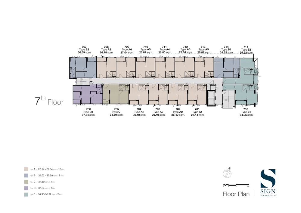 ชั้น 1 : เป็นพื้นที่จอดรถ ชั้น 2 : จะเป็นส่วนของ Lobby และห้องพักอาศัย ชั้น 3-7 : จะคล้ายกันห้องพักอาศัยจำนวน 16 ยูนิต ชั้น 8 : จะเป็นส่วนของห้องฟิตเนส และสระว่ายน้ำ และมีห้องพักอาศัย 11 ยูนิต