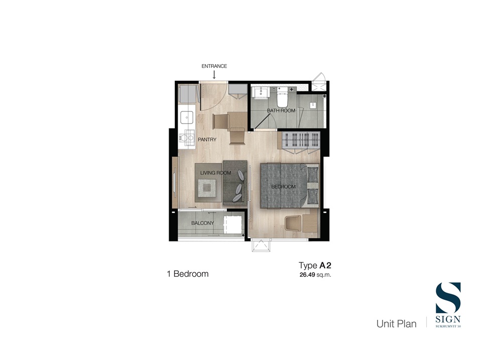 1) แบบ 1 Bedroom (Tyep A2) พื้นที่ใช้สอยขนาด 26.49 ตร.ม.
