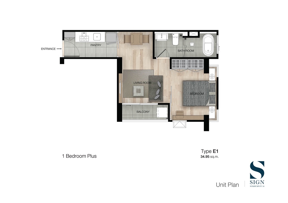 2) ห้องแบบ 1 Bedroom Plus (Type E1) ขนาด 34.95 ตร.ม.