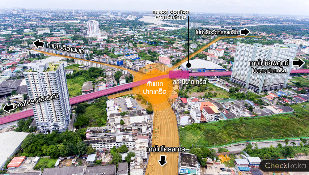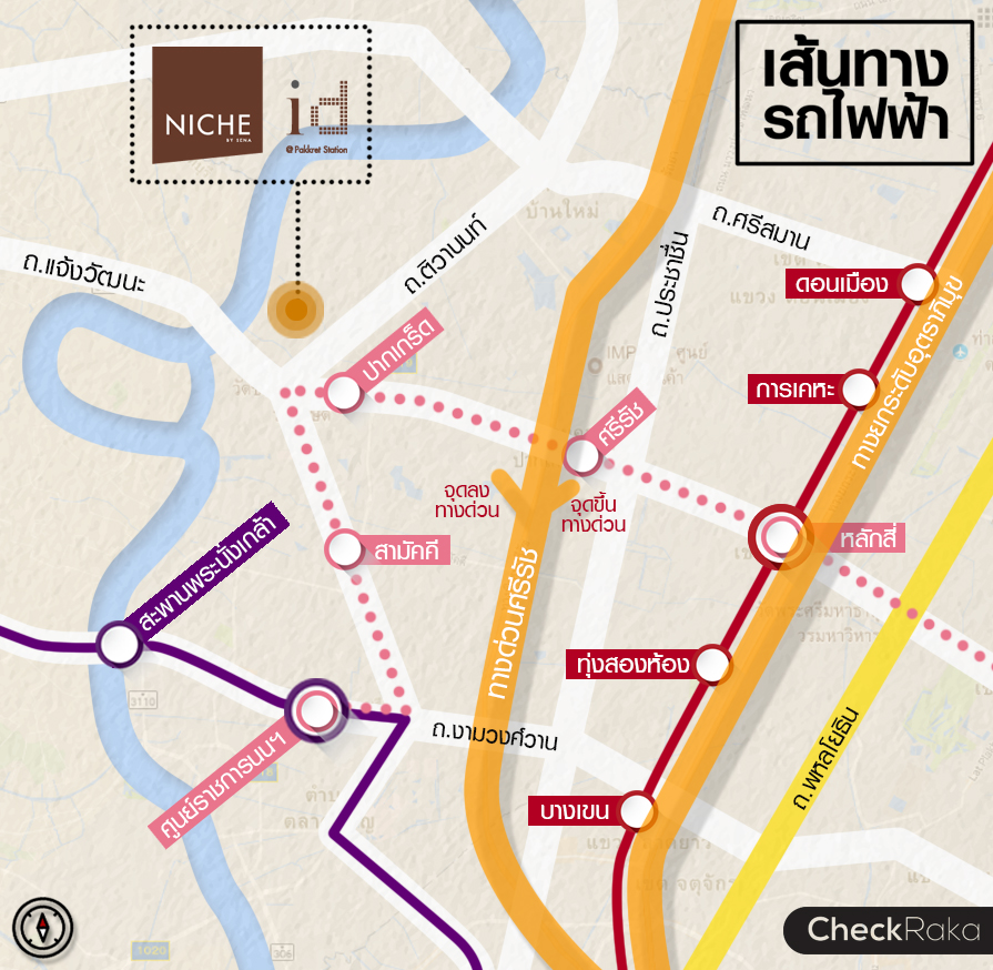 รถไฟฟ้าสายสีชมพู เป็นระบบขนส่งมวลชนสายรองประเภทรถไฟฟ้ารางเดี่ยว (Straddle Monorail) ช่วงแคราย-มีนบุรี รวมระยะทาง 34.5 กิโลเมตร จำนวน 30 สถานี เริ่มจากสถานีศูนย์ราชการนนทบุรีไปจนถึงสถานีมีนบุรี ซึ่งคาดว่าจะเปิดให้บริการได้ในปี 2563 ส่วนสถานีที่ใกล้โครงการนิช ไอดี แอท ปากเกร็ด สเตชั่น มากที่สุดนั้นคือ สถานีปากเกร็ด ระยะห่างประมาณ 600 เมตร ก็ถือว่าอยู่ในระยะที่เดินได้ แต่หน้าโครงการก็มีป้ายรถเมล์นะคะ นั่งรถเมล์มาไม่ถึง 5 นาทีก็ถึงสถานีปากเกร็ดแล้วค่ะ ซึ่งในอนาคตก็จะเชื่อมต่อกับรถไฟฟ้าสายสีม่วง มีจุดเชื่อมต่อกับรถไฟฟ้าสายสีแดงที่สามารถเดินทางออกไปรังสิตได้อย่างง่ายดาย ใน 5 ปีข้างหน้า เส้นทางรถไฟฟ้าจะพาดผ่านย่านนี้และเดินทางง่าย ไม่ต้องกังวลเรื่องรถติดแล้วล่ะค่ะ
