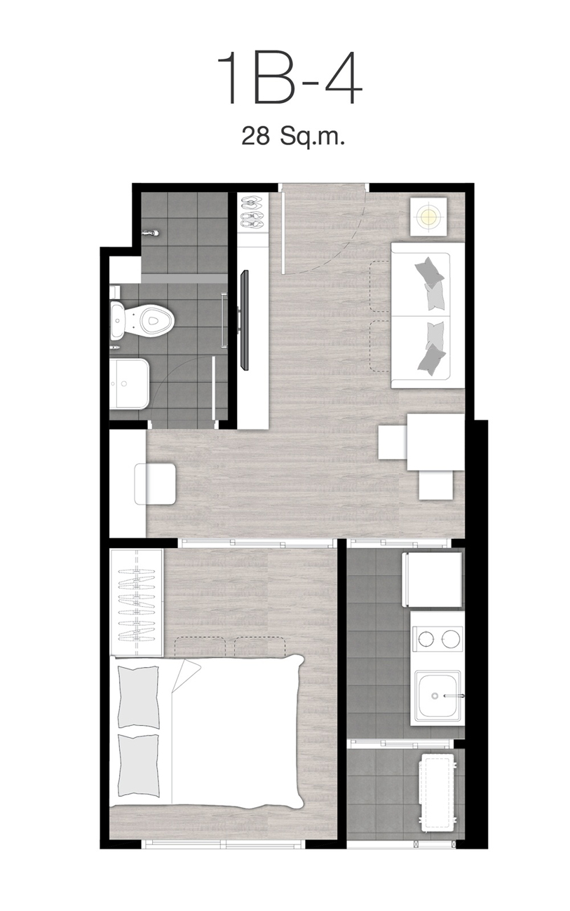 ขนาด 25.25 ตร.ม. จำนวน 11 ยูนิต ห้องแบบ 1 Bedroom ขนาด 28 ตร.ม. จำนวน 17 ยูนิต ห้องแบบ 1 ห้องนอน