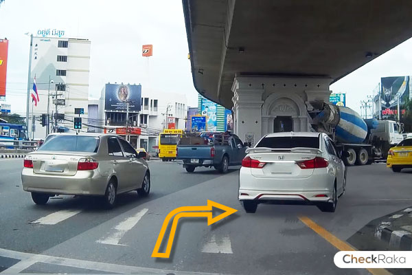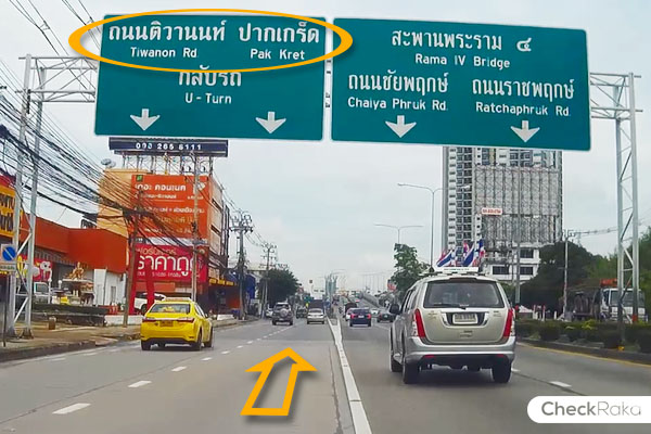 ถึงห้าแยกปากเกร็ดแล้วชิดขวาไว้เลยนะคะ เราจะเลี้ยวขวาไปยังถนนติวานนท์กันค่ะ