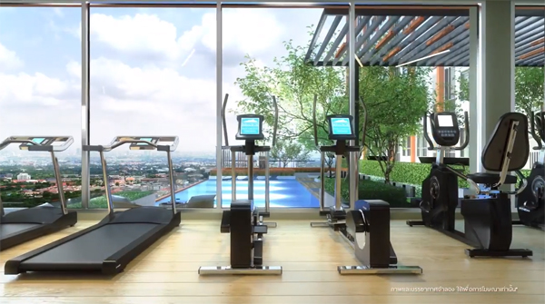 ภาพจำลองบรรยากาศภายในห้องฟิตเนส สามารถมองเห็นวิวสระว่ายน้ำได้