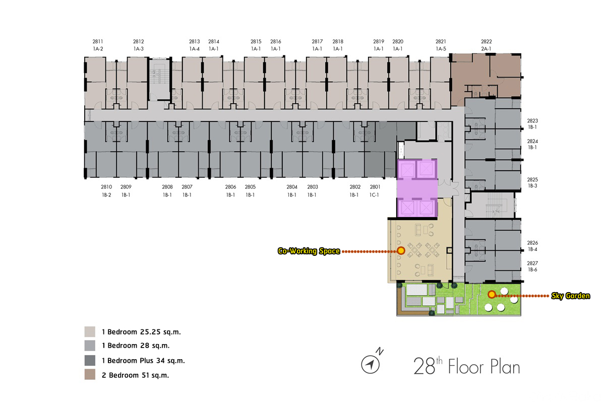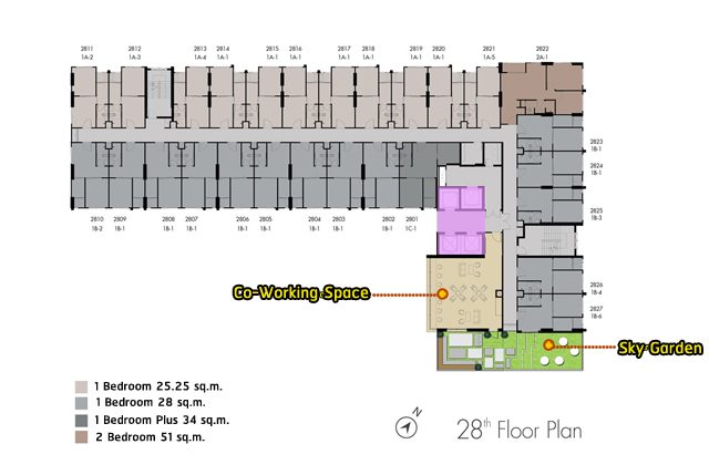 ชั้น 28 : เป็นชั้นของสิ่งอำนวยความสะดวกอย่าง Co-Working Space, Sky Garden และส่วนพักอาศัยอีก 27 ยูนิต แบ่งเป็นห้องแบบ 1 Bedroom ขนาด 25.25 ตร.ม. จำนวน 11 ยูนิต ห้องแบบ 1 Bedroom ขนาด 28 ตร.ม. จำนวน 14 ยูนิต ห้องแบบ 1 ห้องนอน ขนาด 34 ตร.ม. จำนวน 1 ยูนิต และห้องแบบ 2 ห้องนอน ขนาด 51 ตร.ม. อีก 1 ยูนิต