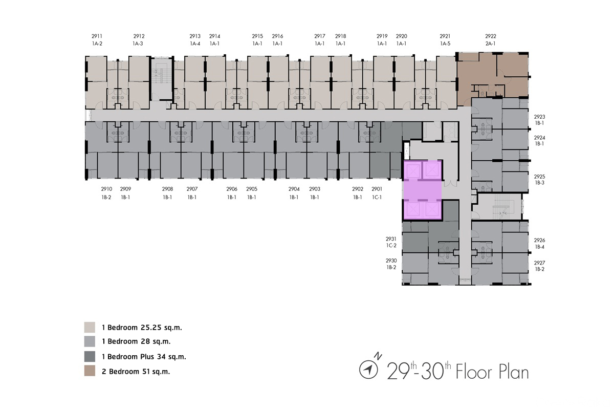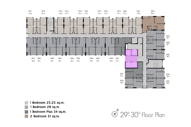 ชั้น 29-30 : คล้ายกันคือเป็นเป็นส่วนพักอาศัย มียูนิตพักอาศัยอยู่ที่ 29 ยูนิต/ ชั้น แบ่งเป็นห้องแบบ 1 Bedroom ขนาด 25.25 ตร.ม. จำนวน 11 ยูนิต ห้องแบบ 1 Bedroom ขนาด 28 ตร.ม. จำนวน 15 ยูนิต ห้องแบบ 1 ห้องนอน ขนาด 34 ตร.ม. จำนวน 2 ยูนิต และห้องแบบ 2 ห้องนอน ขนาด 51 ตร.ม. อีก 1 ยูนิต