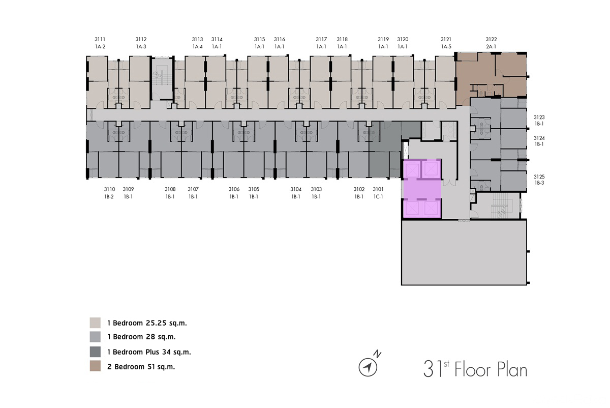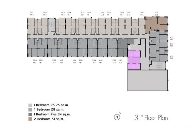 ชั้น 31 : เป็นส่วนพักอาศัย 24 ยูนิต แบ่งเป็นห้องแบบ 1 Bedroom ขนาด 25.25 ตร.ม. จำนวน 11 ยูนิต