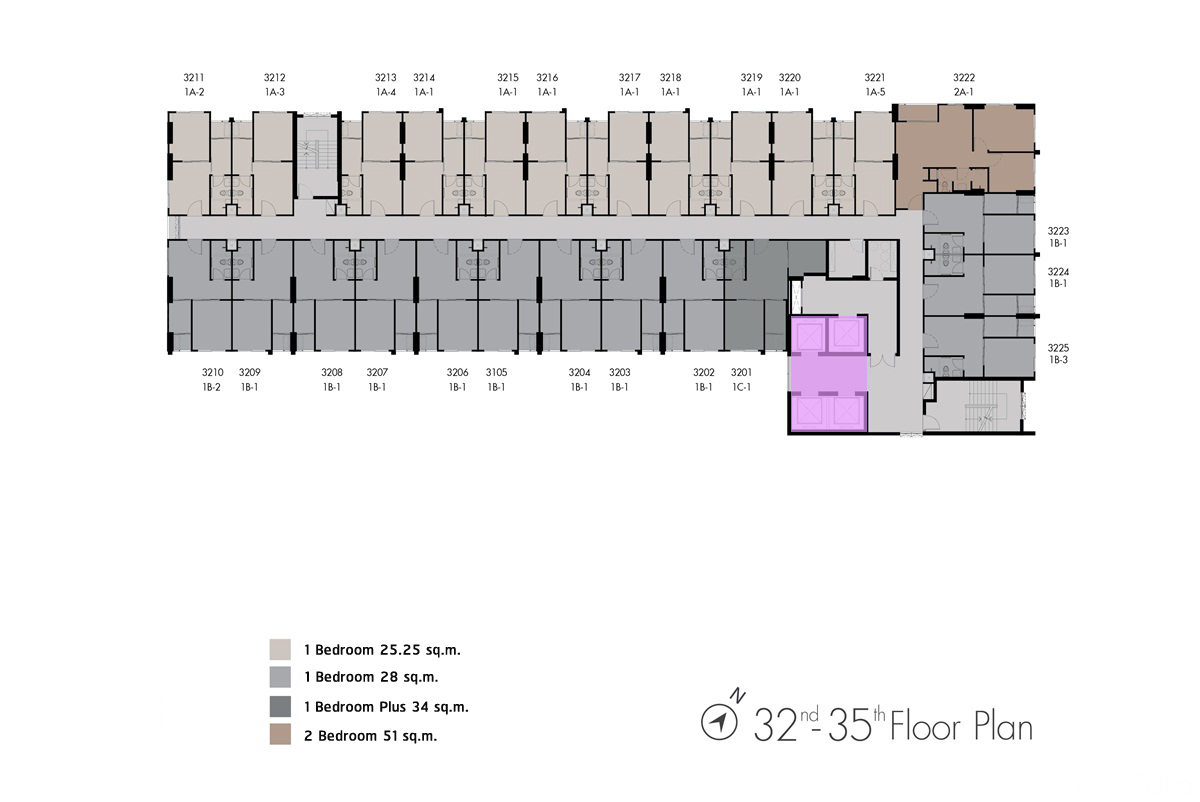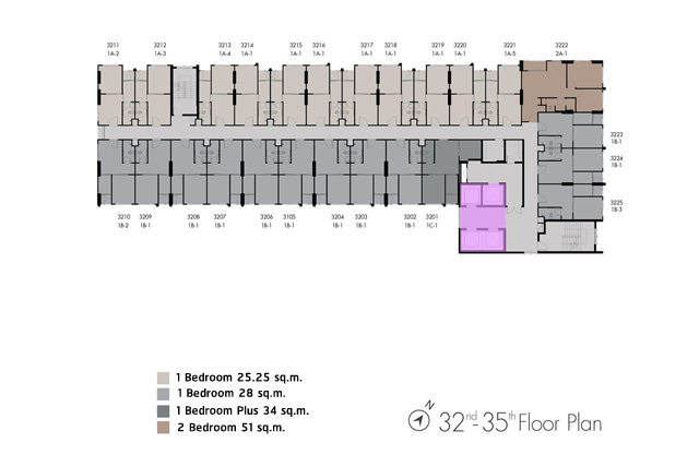 ชั้น 32-35 : คล้ายกันคือเป็นเป็นส่วนพักอาศัย มียูนิตพักอาศัยอยู่ที่ 25 ยูนิต/ ชั้น แบ่งเป็นห้องแบบ 1 Bedroom