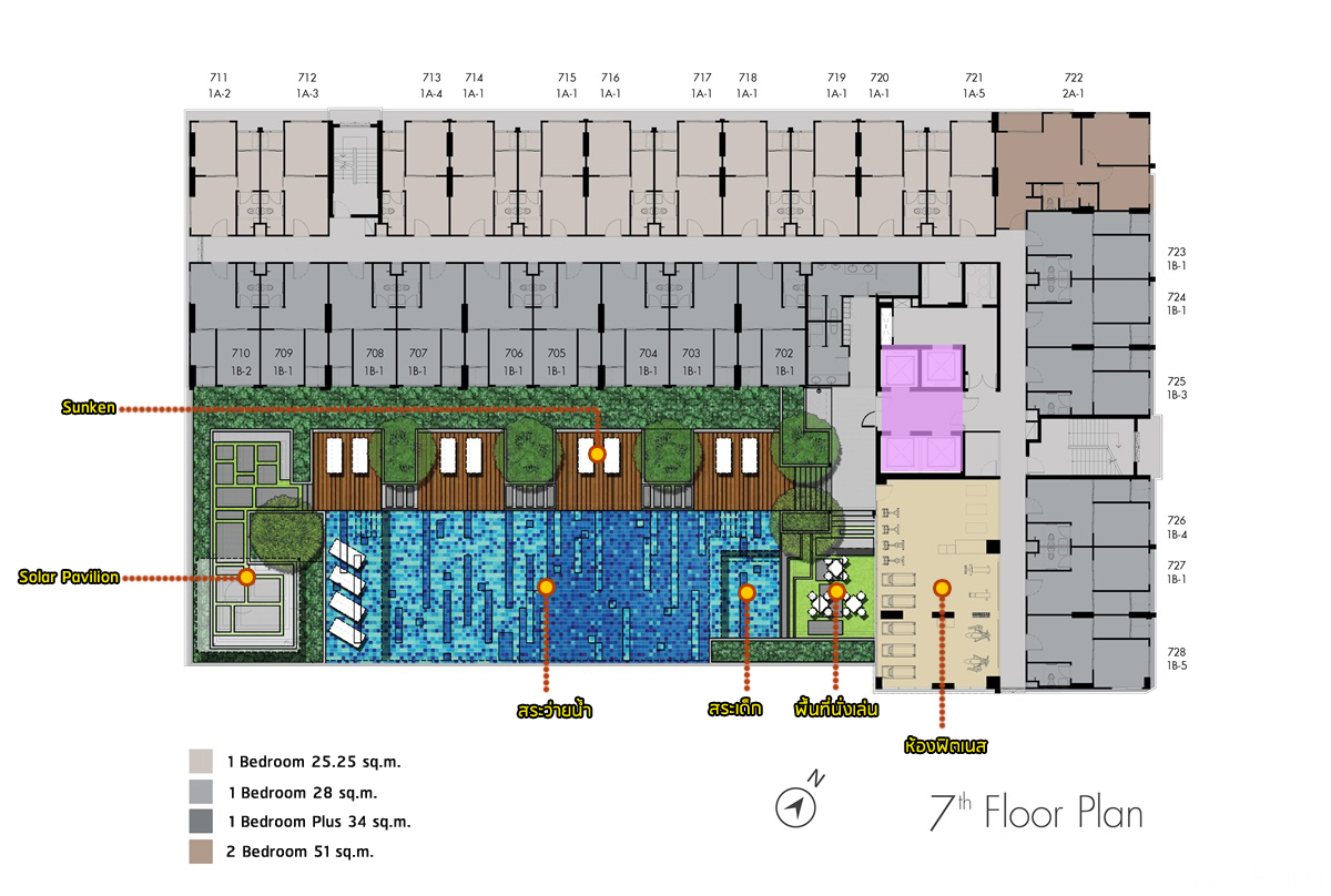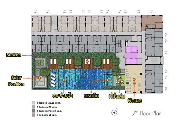 ชั้น 7 : เป็นชั้นของสิ่งอำนวยความสะดวก และส่วนพักอาศัยอีก 27 ยูนิต แบ่งเป็นห้องแบบ 1 Bedroom ขนาด 25.25 ตร.ม. จำนวน 11 ยูนิต ห้องแบบ 1 Bedroom ขนาด 28 ตร.ม. จำนวน 15 ยูนิต และห้องแบบ 2 ห้องนอน ขนาด 51 ตร.ม.