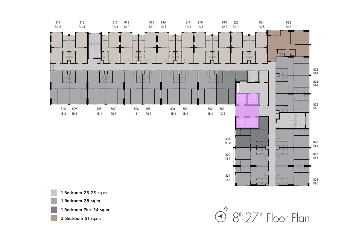 ชั้น 8-27 : จะคล้ายกันคือเป็นเป็นส่วนพักอาศัย มียูนิตพักอาศัยอยู่ที่ 31 ยูนิต/ชั้น แบ่งเป็นห้องแบบ 1 Bedroom