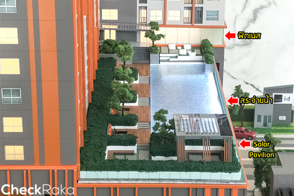 ด้านข้างสระว่ายน้ำเป็น Solar Pavilion มุมพักผ่อนสำหรับให้ลูกบ้านมาชาร์จแบตมือถือได้จากพลังงานแสงอาทิตย์ในตอนกลางวัน โดยโครงการติด Solar ไว้บนศาลาเพื่อช่วยในการผลิตพลังงานไฟฟ้าจากแสงอาทิตย์