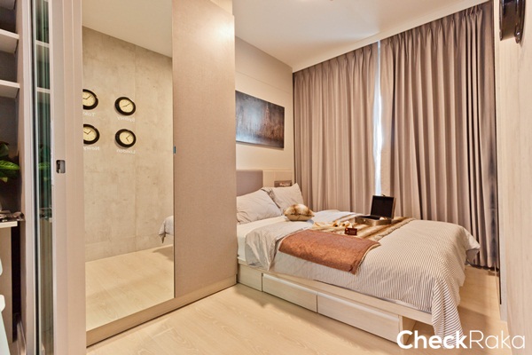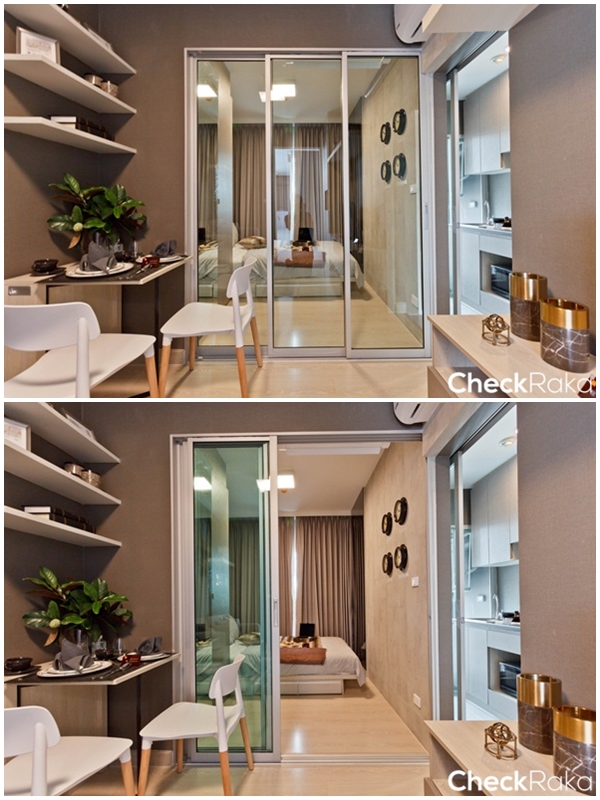ที่สำนักงานขายจัดห้องตัวอย่างมาให้ลูกค้าชมด้วยกัน 2 ห้องนอนค่ะ เป็นของแบบ 1 ห้องนอน ขนาด 25.25 ตร.ม. และห้องแบบ 1 ห้องนอน ขนาด 28 ตร.ม. โดยความสูงจากพื้นถึงเพดานของห้องนอน และห้องนั่งเล่นสูง 2.6 เมตร ส่วนห้องครัว และห้องน้ำสูง 2.4 เมตร ทำให้ห้องดูโปร่ง และกว้างมากขึ้น