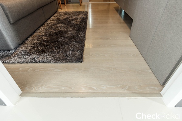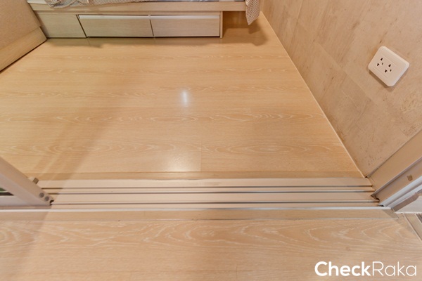 ตัวจบประตูเป็นลามิเนตปิดรอยต่อระหว่างพื้นห้องนอนกับโถงทางเดิน พื้นห้องปูด้วยลามิเนตหนา 8 มม.