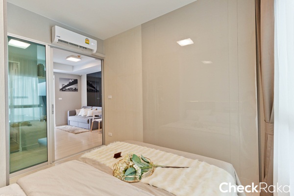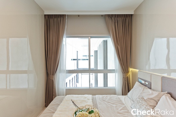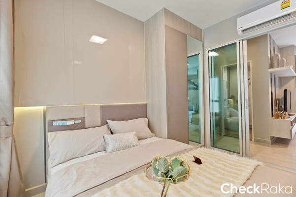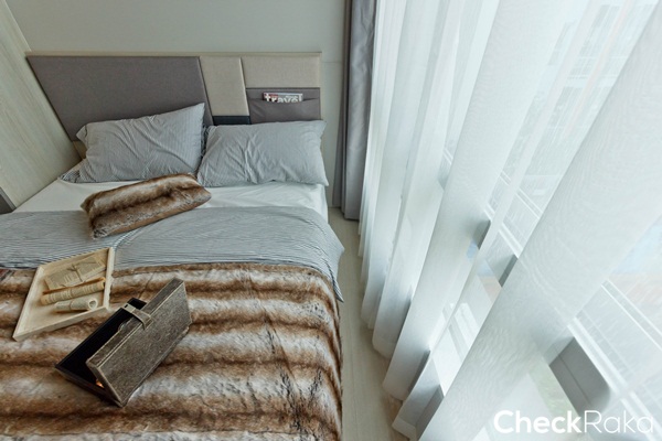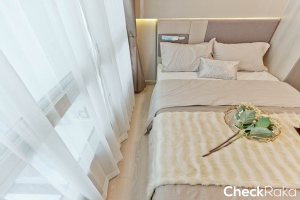 พื้นที่ห้องนอนดูกว้างกว่าห้องที่แล้ว วางเตียงไว้ชิดฝั่งหน้าต่าง ระยะปลายเตียงเหลือทางเดินประมาณ 50 ซม.