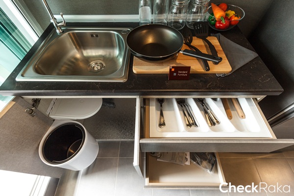 เคาน์เตอร์ด้านล่างมีลิ้นชักสำหรับเก็บอุปกรณ์ทำครัว พร้อมถาดเก็บช้อนและมีด
