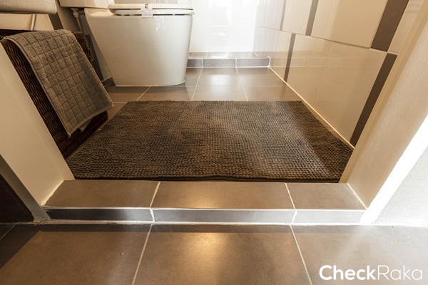 ยกธรณีห้องน้ำยกสูงขึ้นประมาณ 3 ซม. ป้องกันน้ำไหลจากห้องน้ำออกมายังพื้นครัว