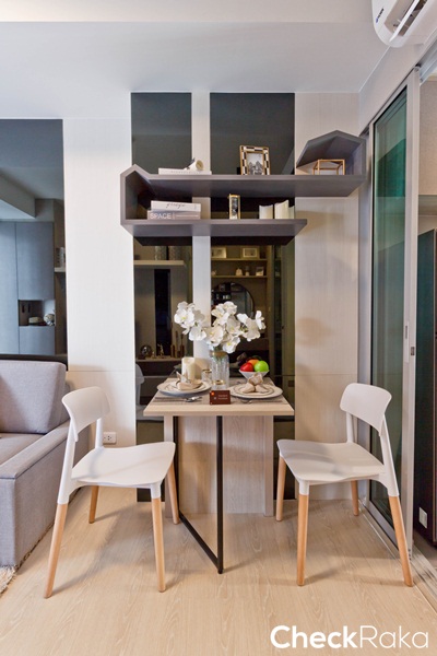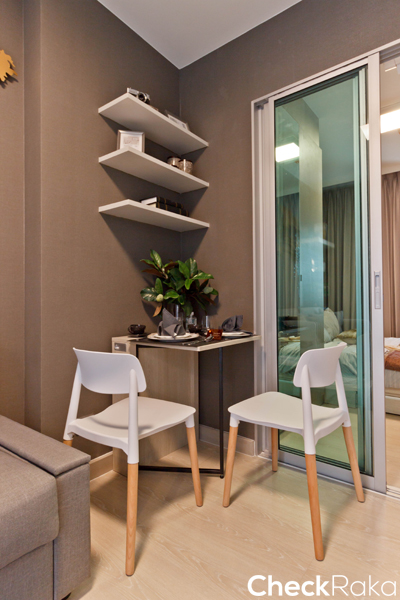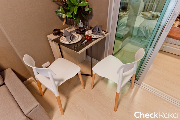 ได้โต๊ะทานข้าวอเนกประสงค์พร้อมเก้าอี้ 2 ตัว ตั้งอยู่ระหว่างโซฟากับห้องครัว
