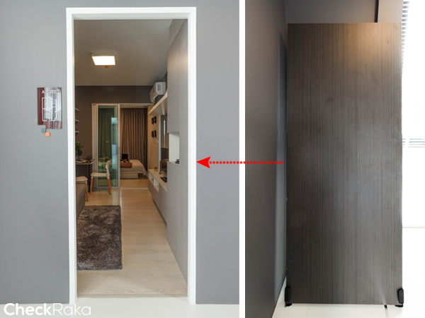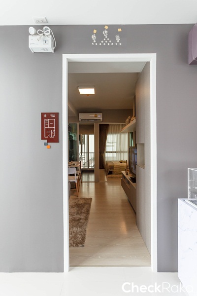 มุมนี้ถ่ายจากหน้าห้องครัวมองกลับไปยังประตูทางเข้าห้อง เพื่อให้เห็นภาพรวมของโซนห้องนั่งเล่น