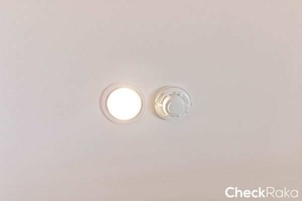 เพดานในห้องครัวได้ไฟดาวน์ไลท์ทรงกลม พร้อมเครื่องดูดจับควัน