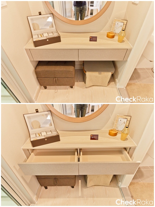 ทางโครงการ Built-in โต๊ะอเนกประสงค์ไว้ให้อยู่ระหว่างห้องนอนกับห้องน้ำ โดยจะทำเป็นโต๊ะเครื่องแป้งก็ได้