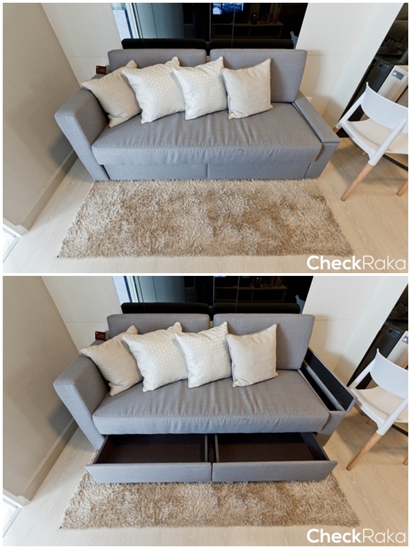โซฟาออกแบบมาพิเศษมีช่องสำหรับเก็บรีโมทอยู่ด้านข้าง พร้อมลิ้นชักเก็บของใต้เบาะรองนั่ง