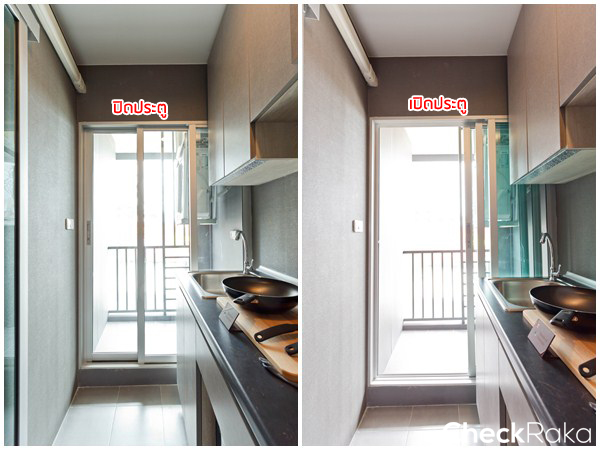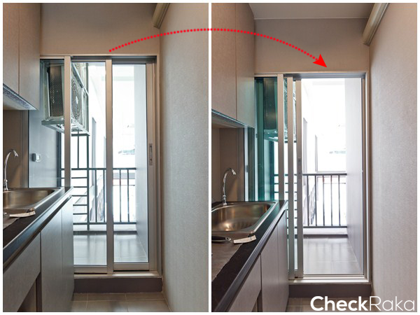 ครัวยังคงอยู่ติดกับระเบียง เปิดประตูเพื่อช่วยระบายกลิ่นเวลาที่ทำอาหารได้ดี