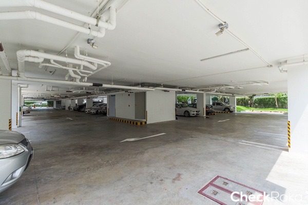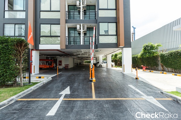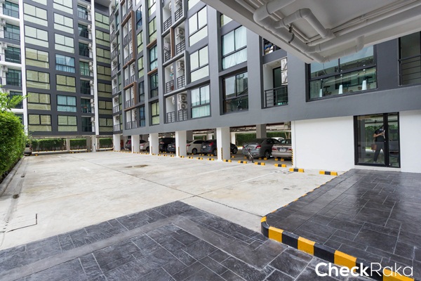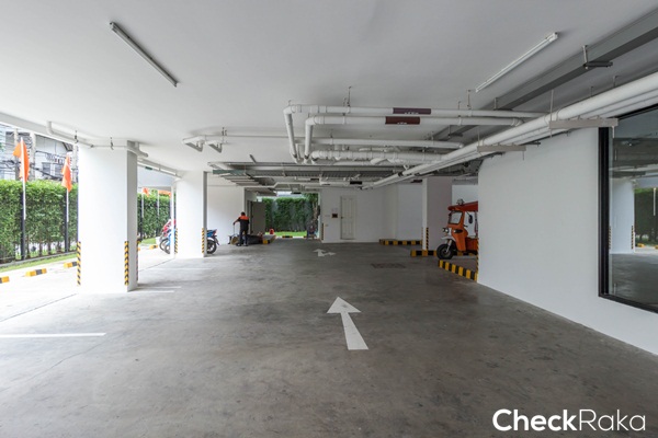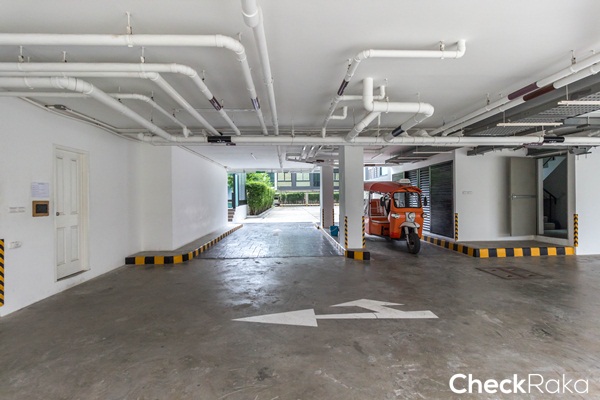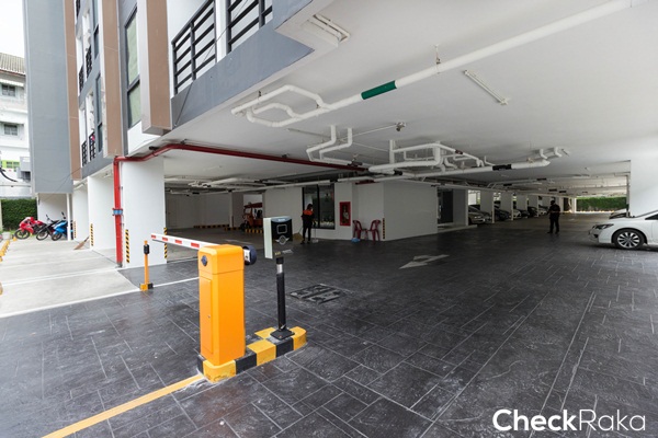 พื้นที่สำหรับจอดรถกลางแจ้ง ทางซ้ายมือเป็นสระว่ายน้ำส่วนกลาง ส่วนทางขวามือเป็นพื้นที่จอดรถใต้อาคาร