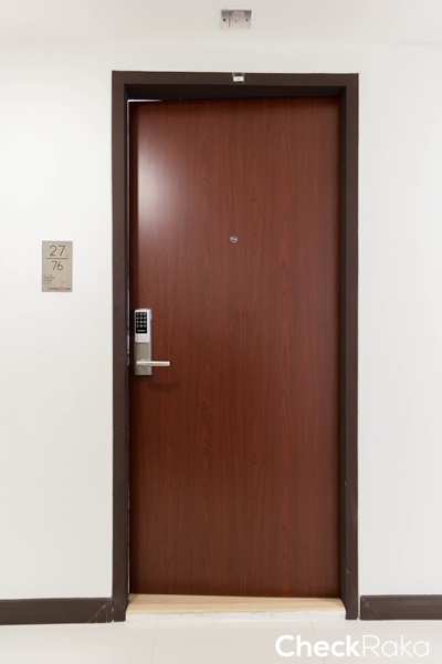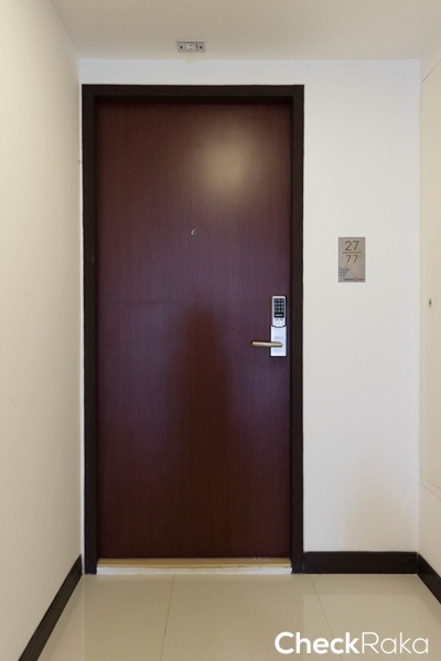 ประตูทางเข้าห้องเป็นประตูลายไม้ มือจับแบบการโยก พร้อมช่องมองตาแมว