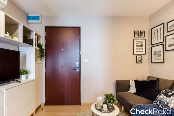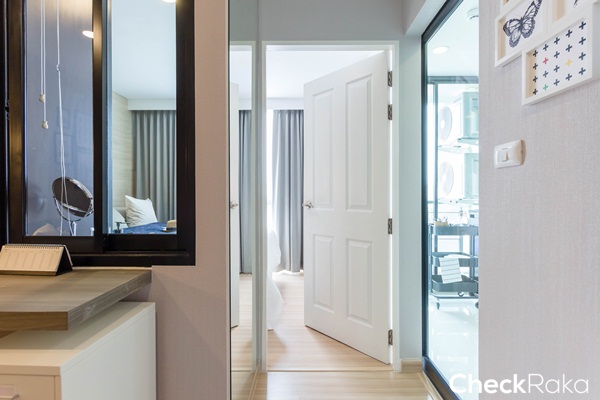 ส่วนห้องตัวอย่างที่จะพาไปดูกันในวันนี้เป็นห้องที่อยู่บนอาคารจริงบนชั้น 4 ของอาคารพักอาศัย โดยทางโครงการจัดไว้ให้ดู 2 ห้องด้วยกัน เป็นห้องแบบ 1 ห้องนอน ขนาด 29.27 ตร.ม. และ 38.29 ตร.ม. ตามเราไปดูทีละห้องกันเลยค่ะ เริ่มจากห้องแรก