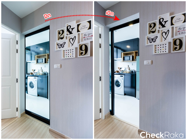 ห้องครัวแบ่งเป็นสัดส่วนด้วยประตูบานเลื่อนกรอบอลูมิเนียมสีดำ รางประตูเป็นแบบแขวนทำความสะอาดง่าย