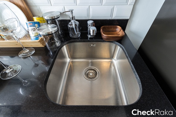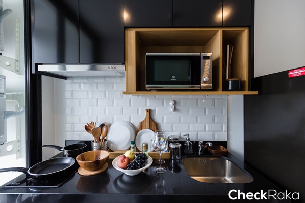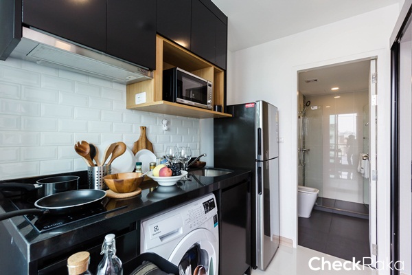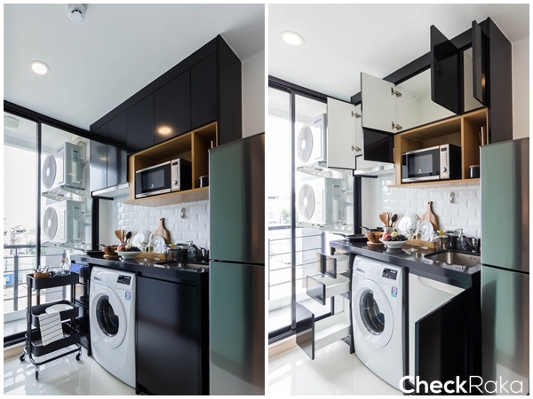 หน้าท็อปเคาน์เตอร์ครัวเป็นหินเทียมสีดำ มีที่วางเครื่องซักผ้าแบบฝาหน้าขนาด 8 กก. ใต้เคาน์เตอร์
