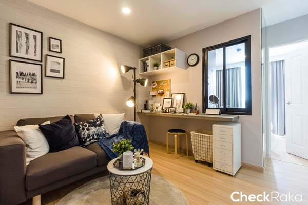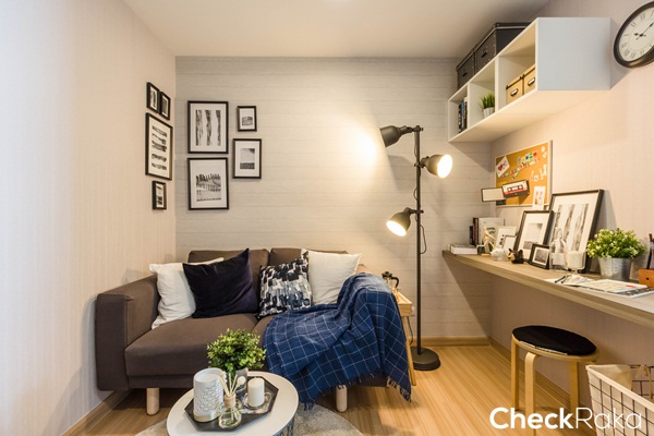 โซนห้องนั่งเล่นสามารถวางโซฟาได้ขนาด 2 ที่นั่ง พร้อมโต๊ะกลางเล็กๆ 1 ตัว