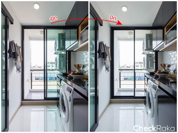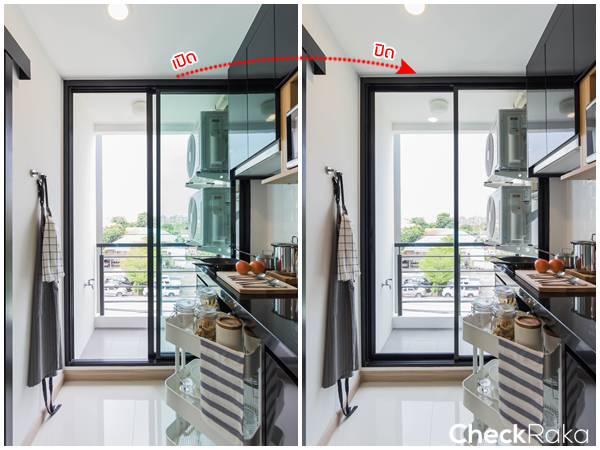 ประตูระเบียงแบบบานเลื่อน 2 ตอน เปิดช่วยระบายกลิ่นเวลาทำอาหารได้ดี