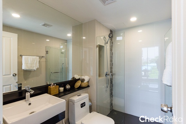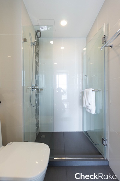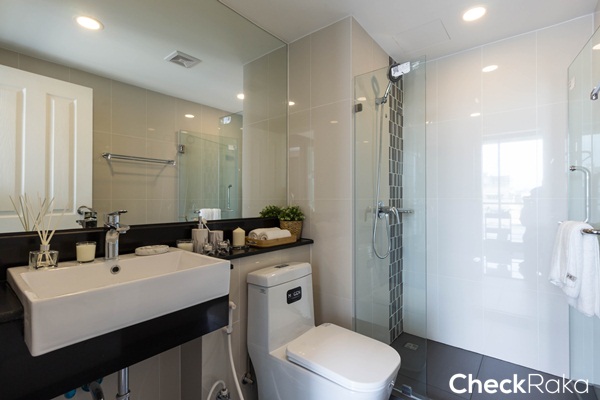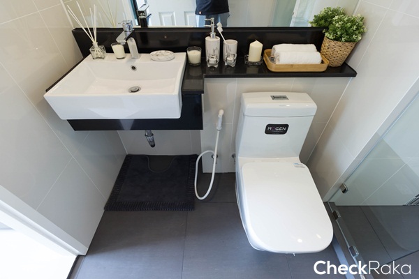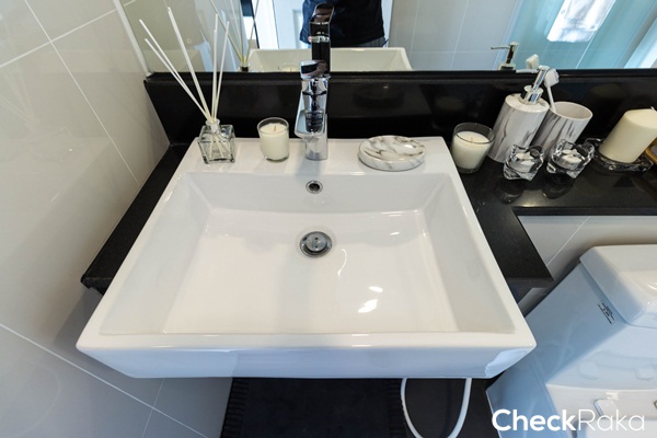 อ่างล้างหน้าทรงสี่เหลี่ยม ทางโครงการก่อเคาน์เตอร์สีดำเพิ่มพื้นที่สำหรับวางอุปกรณ์อาบน้ำ