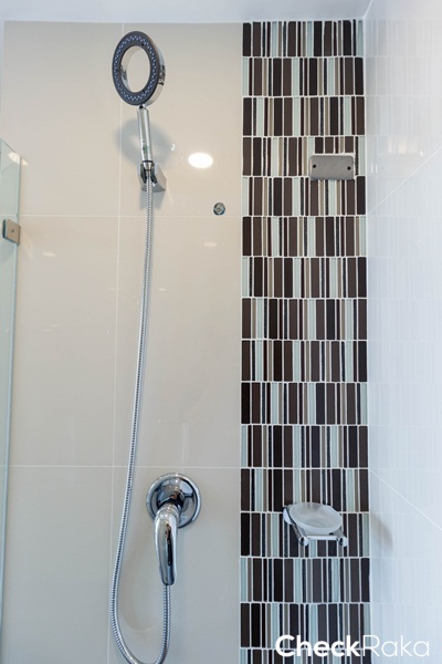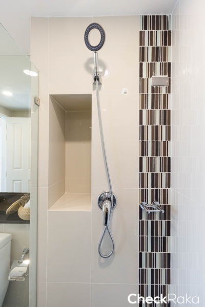 ผนังบริเวณ Shower กรุด้วยกระเบื้องแกรนิตโต้ ขนาด 60 x 60 ซม. บางส่วนตกแต่งด้วยกระเบื้องโมเสคโทนสีเทาน้ำตาล