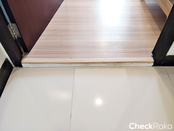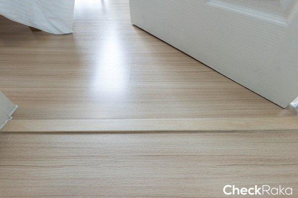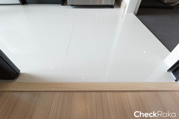 ระหว่างพื้นห้องนั่งเล่นและห้องครัวจบด้วยลามิเนต