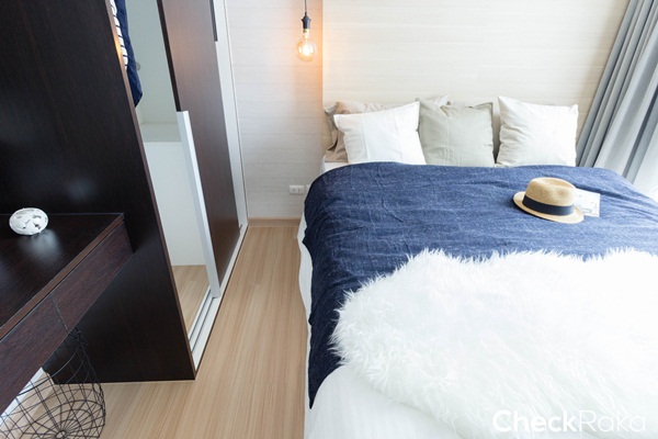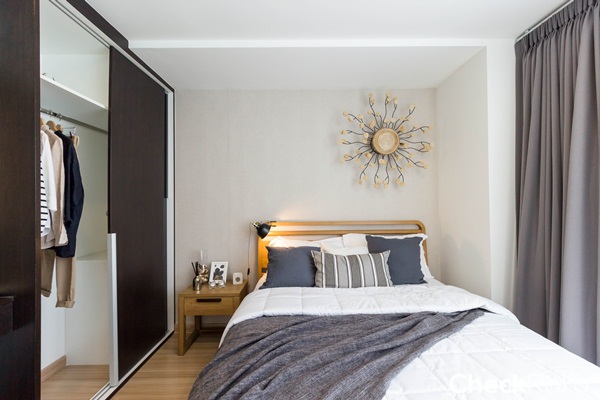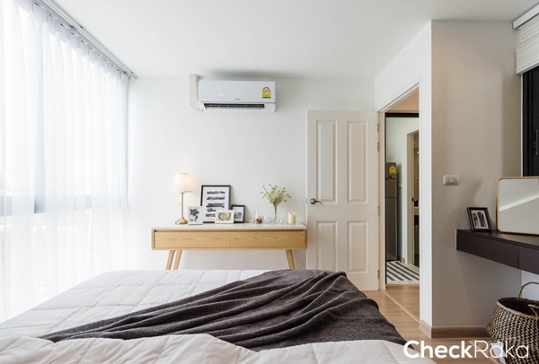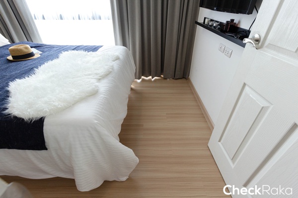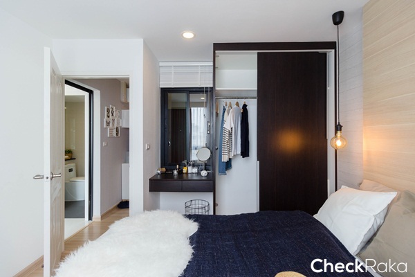 พื้นที่ข้างเตียงถึงตู้เสื้อผ้าเหลือประมาณ 90 ซม. สามารถวางโต๊ะข้างเตียงขนาดเล็กๆ ได้ 1 ตัว