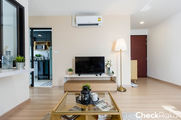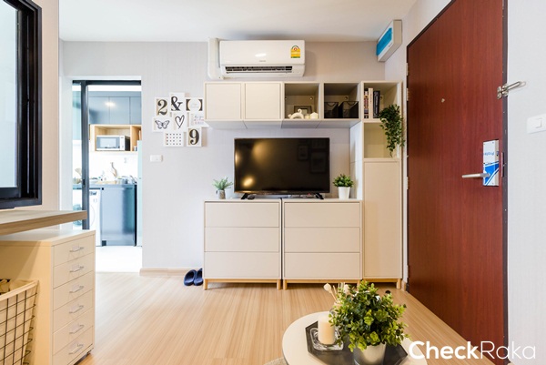 ฝั่งตรงข้ามโซฟาวางเป็นชั้นวางทีวี สามารถติดแอร์ได้ที่ผนังเหนือชั้นวางทีวี