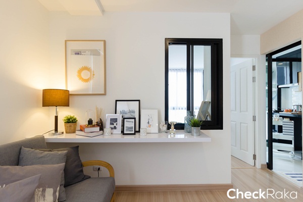 ฝั่งขวาของห้องนั่งเล่นทางโครการ Built-in เป็นโต๊ะอเนกประสงค์ยาวตลอดแนวผนังมาให้ วัสดุปิดผิวสีขาวได้ตามแบบนี้เลย ติดหน้าต่างกระจกบานเลื่อนกรอบอลูมิเนียมสีดำมาให้ 1 บาน