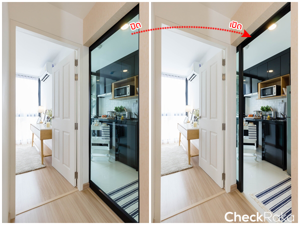 ห้องนี้ก็ได้ครัวปิดเช่นกัน ได้ประตูกระจกบานเลื่อนสีเขียวตัดแสง