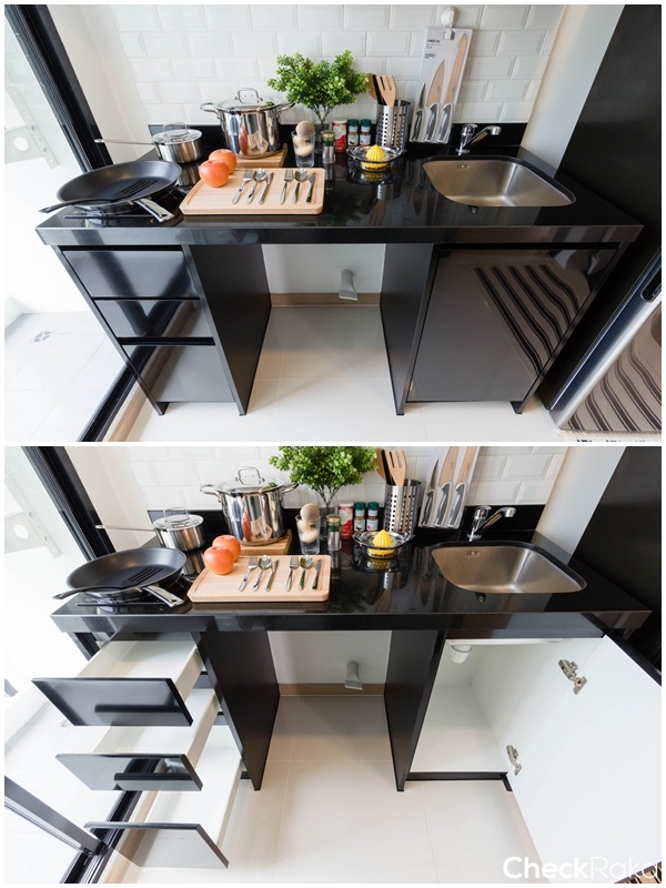 ทางซ้ายมีลิ้นชัก 3 ชั้น สำหรับเก็บของ และอุปกรณ์ทำครัว ส่วนด้านขวาใต้อ่างล้างจานก็มีช่องสำหรับเก็บของอีก 1 ช่อง