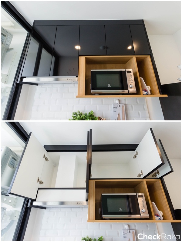 หน้าบานปิดผิวด้วยไฮกลอส (High-Gloss) สีดำ ส่วนบานพับตู้ทั้งหมดเป็นแบบ Soft-Closes