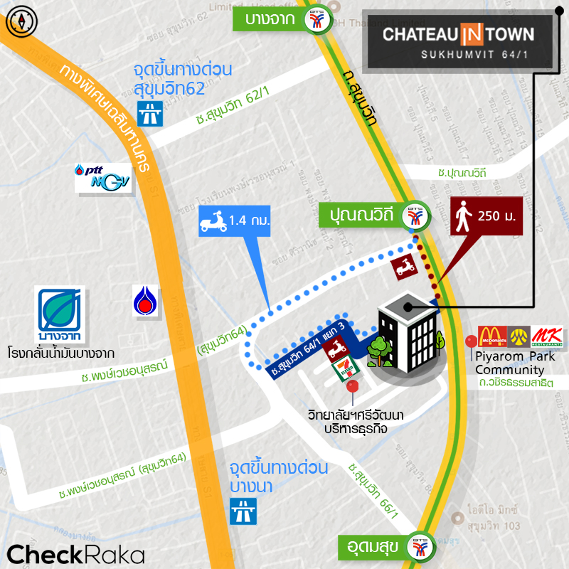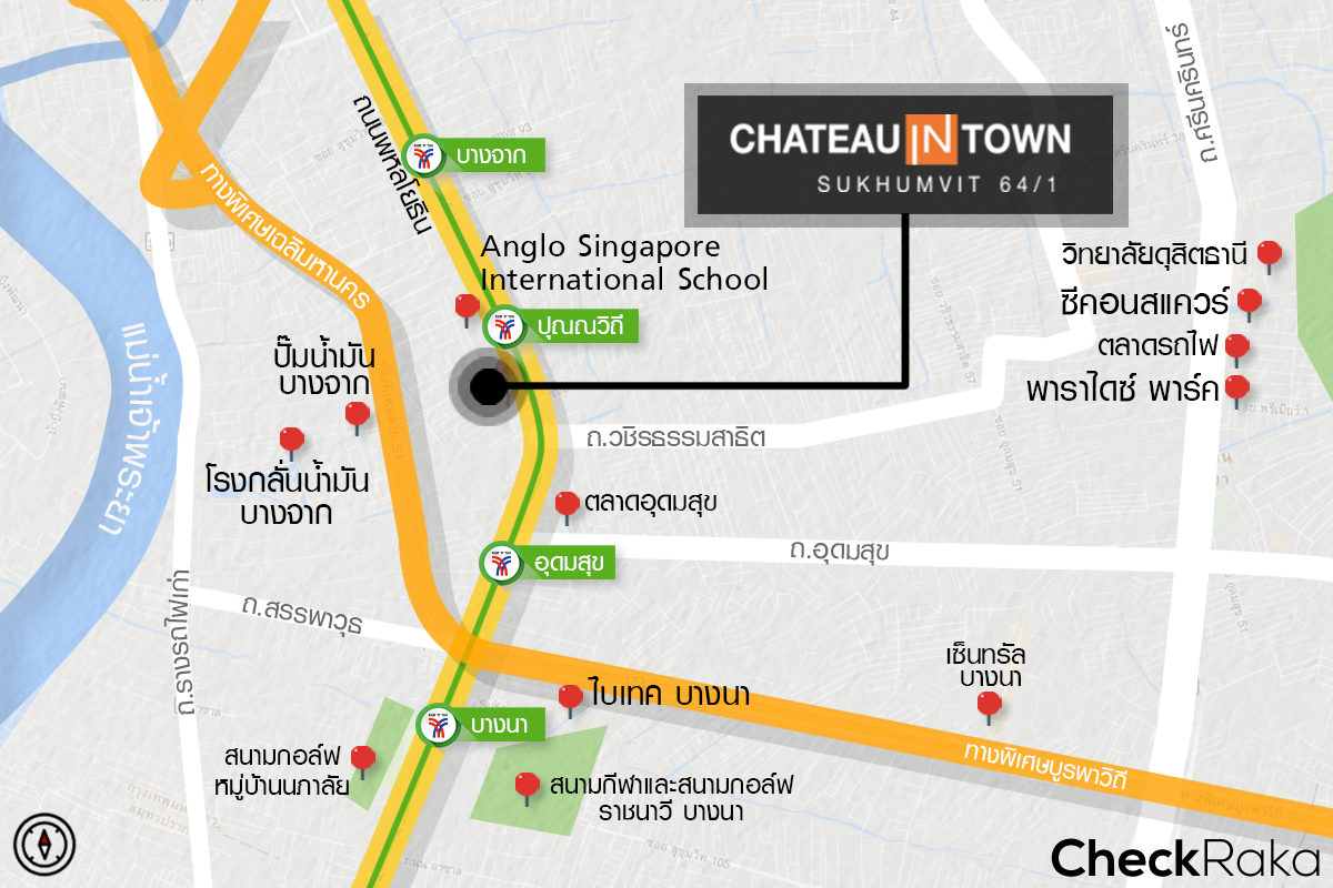 Chateau in Town สุขุมวิท 64/1 ตั้งอยู่ในซอยสุขุมวิท 64/1 ห่างจากถนนใหญ่สุขุมวิทประมาณ 50 เมตร เป็นระยะที่เดินได้สบายๆ เลยค่ะ ดูจากแผนที่แล้ว สังเกตว่าสถานที่อำนวยความสะดวกต่างๆ ก็พอมีอยู่บ้าง หลักๆ กระจุกตัวอยู่แถวๆ ถ.ศรีนครินทร์ เพราะมีทั้งซีคอนสแควร์ พาราไดซ์ พาร์ค ตลาดรถไฟ วิทยาลัยดุสิตธานี และสวนหลวง ร.9 ส่วนโซนใกล้ๆ โครงการก็มีโรงเรียนนานาชาติ Anglo Singapore และโรงเรียนพิพัฒนาอยู่ แน่นอนว่ารอบๆ โรงเรียนก็มีร้านอาหาร ร้านกาแฟ ร้านสะดวกซื้อค่อนข้างหนาแน่น รวมถึงคอนโดมิเนียมก็เกิดขึ้นถี่ไม่แพ้กัน